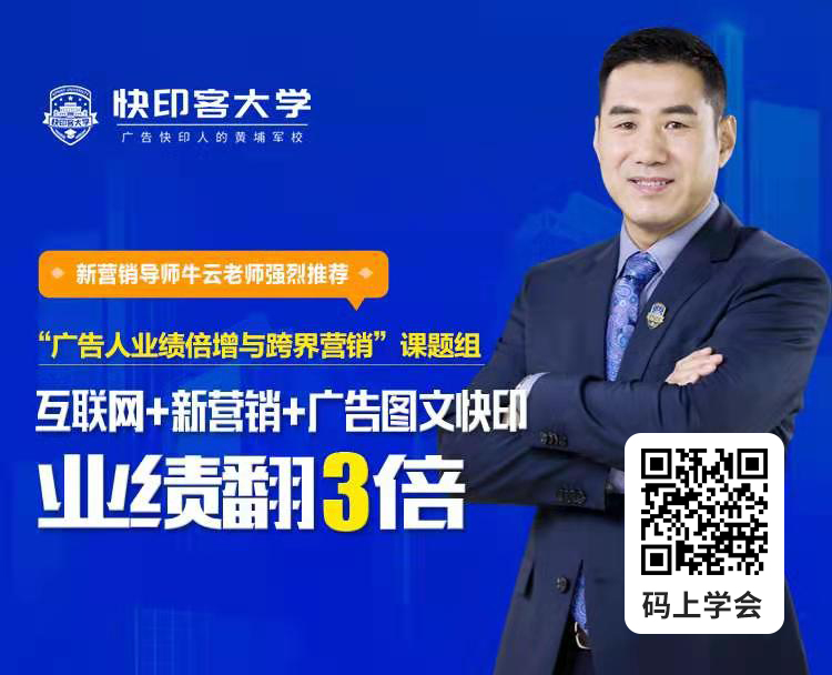 快印客掌門人、中國廣告快印行業(yè)資深導(dǎo)師專家、新營銷學(xué)創(chuàng)始人牛云老師,在他的原創(chuàng)核心觀點(diǎn)中講道:“傳統(tǒng)企業(yè)的核心問題是營銷問題,營銷是從廣告開始的,廣告是財富的入口,是客戶連接的結(jié)點(diǎn)。”移動互聯(lián)網(wǎng)場景下,營銷具備了新的特征和意義,客戶也從線下轉(zhuǎn)到線上,以互聯(lián)網(wǎng)思維和互聯(lián)網(wǎng)技術(shù)為導(dǎo)向的新營銷理念應(yīng)運(yùn)而生。也就是說,只要廣告人幫助企業(yè)解決了營銷問題,就解決了他們的發(fā)展問題。